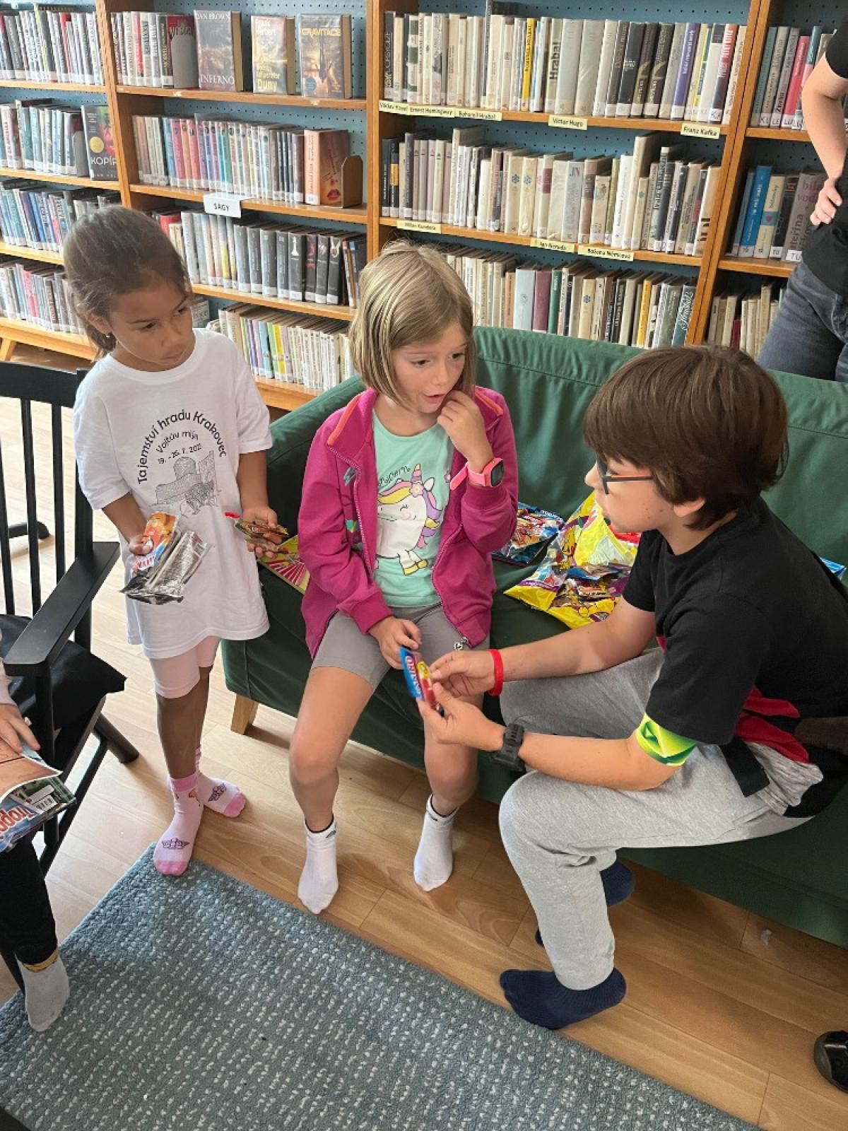 Nechybělo vyrábění hradů z kartonu, soutěžení ve znalostech, ale i fyzické výzvy – třeba skákání na „Šemíkovi“ přes překážkovou dráhu. Vše vyvrcholilo velkou Honbou za pokladem, při které děti hledaly po celém zámeckém parku indicie, luštily hádanky a plnily úkoly, aby objevily skrytý poklad, který na ně čekal v knihovně. Na závěr tak čekala na každého zasloužená odměna – sladkost a malý knižní dárek na památku.